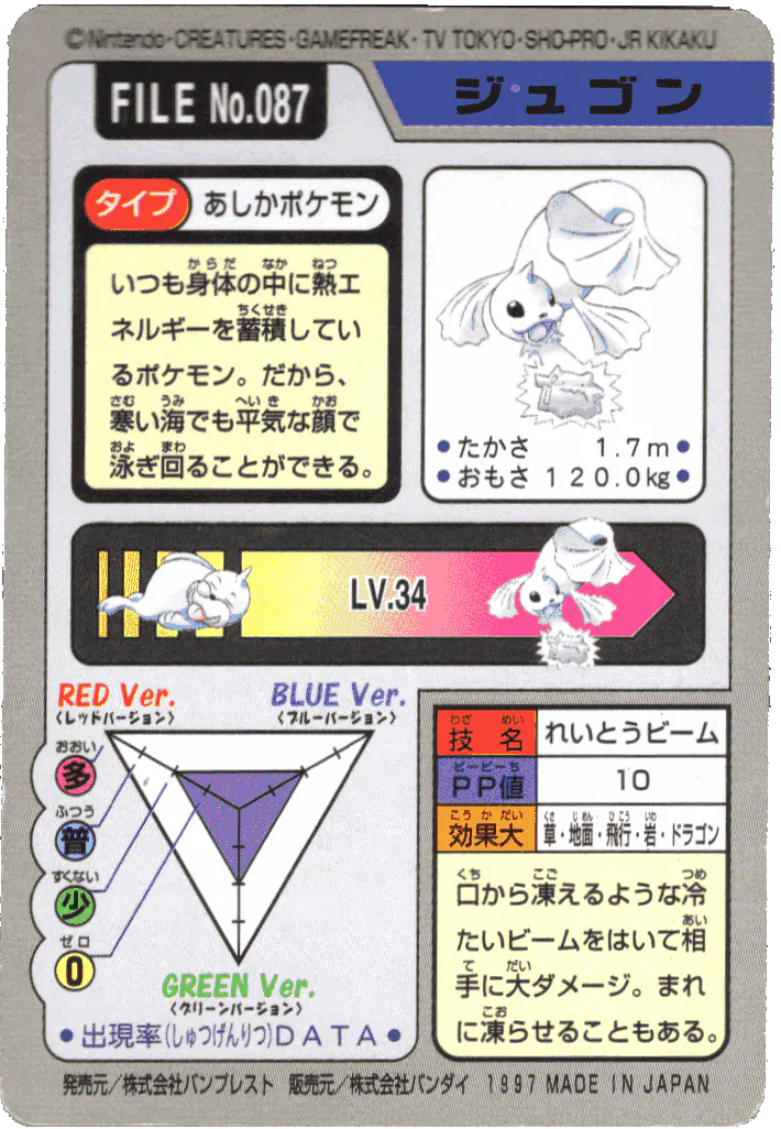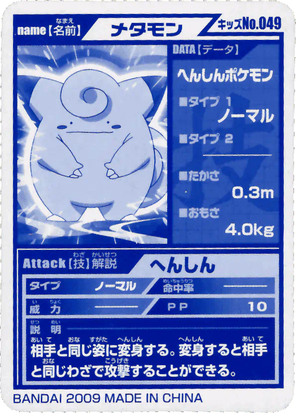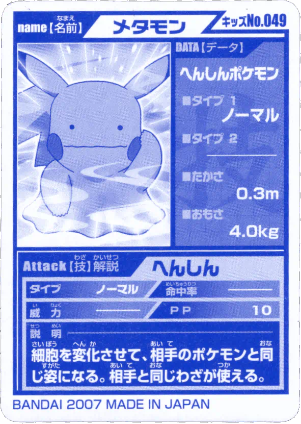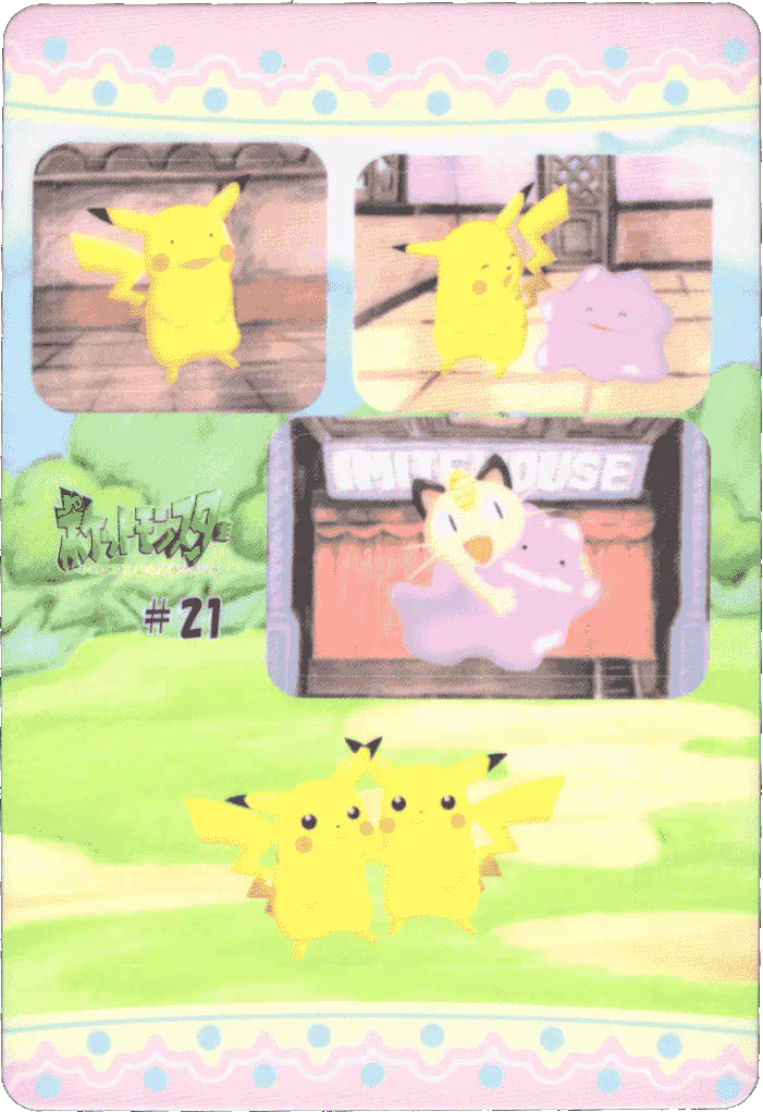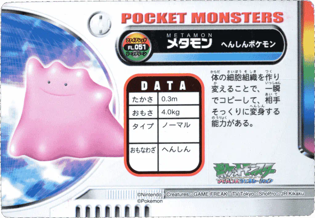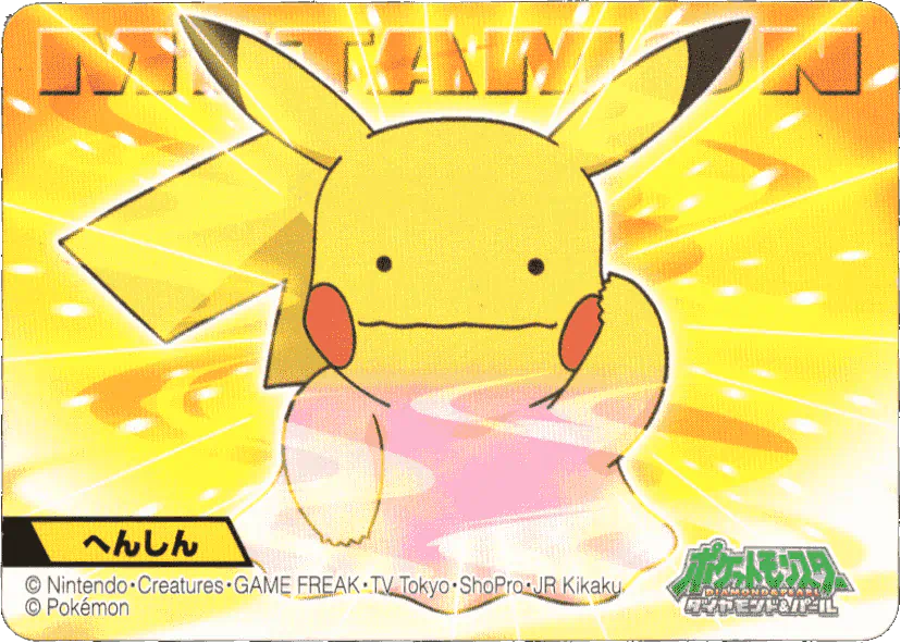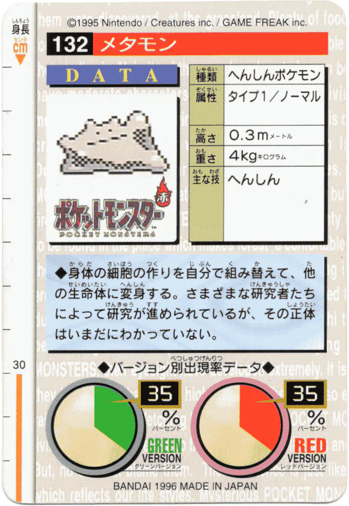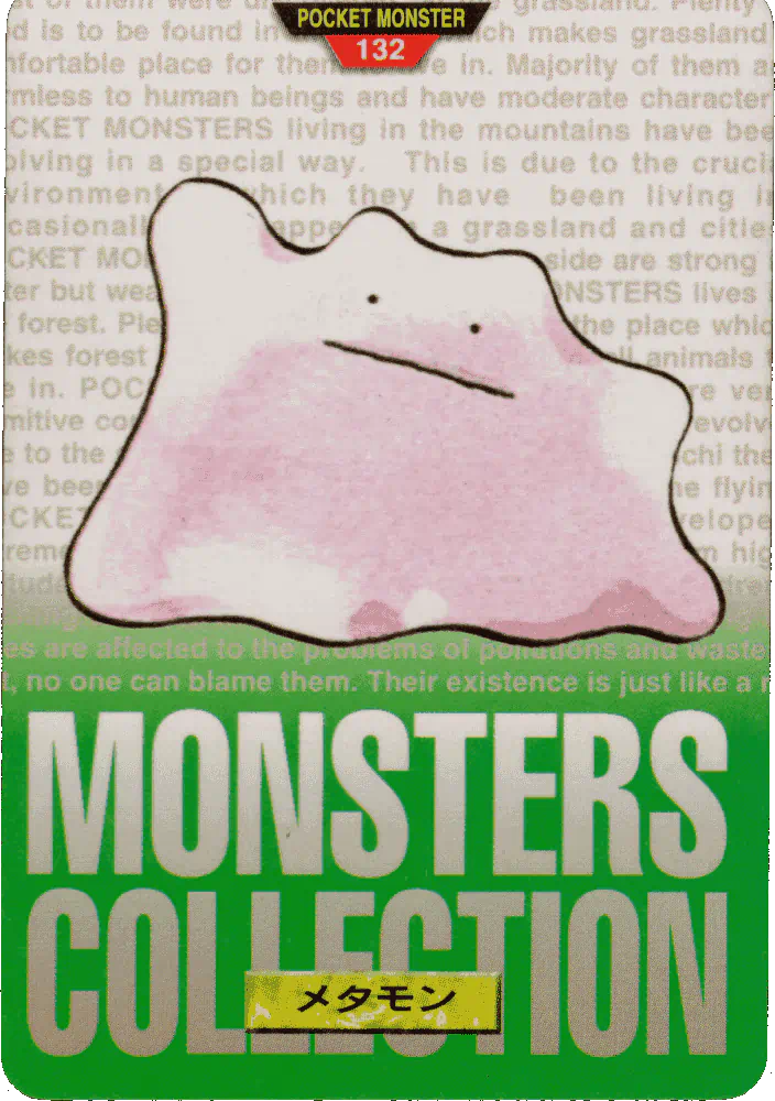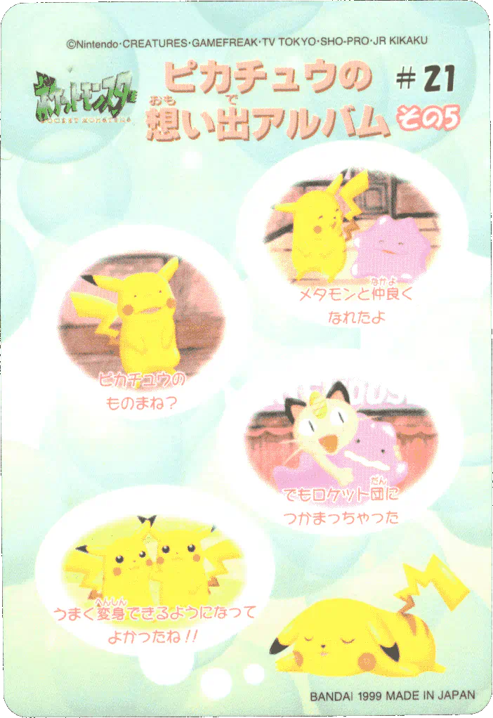 A promotional jumbo Pikachu card was given out at the 1997 Tokyo Toy Expo on March 19-23, 1997, and Part 3 and Part 4 would be released in April and June 1997, respectively. Both sets feature some lovely artwork, re-used from earlier Bandai merch, most likely done in full by Bandai illustrators (and not by Ken Sugimori - for more information on that, please check out this wonderful EliteFourum.com thread!), showcasing a feature move for each 151 Pokémon (e.g. for Ditto, it shows a Ditto mid-transform). Considering how often the early Sugimori Ditto art is used over and over, this is quite the novelty! The backs present similar information as in the Parts 1 and 2 cards, with appearance stats for Red, Green, and Blue.