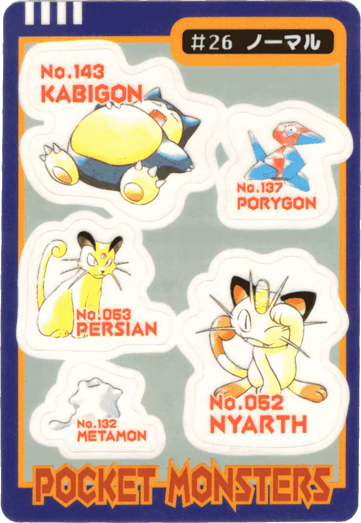 Following the financial success of the Carddass cards and the Pokémon Trading Card Game, Bandai put out a secondary set of vending machine items in late 1997 under a similar name (The Japanese word for "sticker" is "シール," often romanized as "seal"). This time, however, they were stickers on thin cardboard, with Pokémon-specific info such as basic stats, evolution information, and Red/Green moveset on the card back.